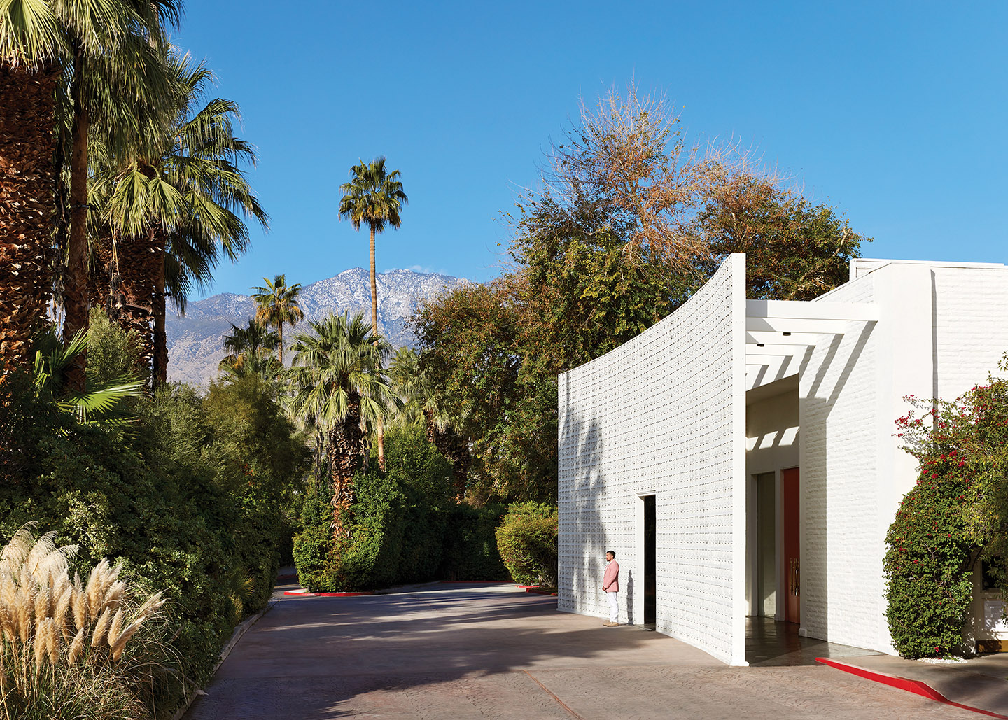 The iconic brise soleil at the entrance of Parker Palm Springs.
