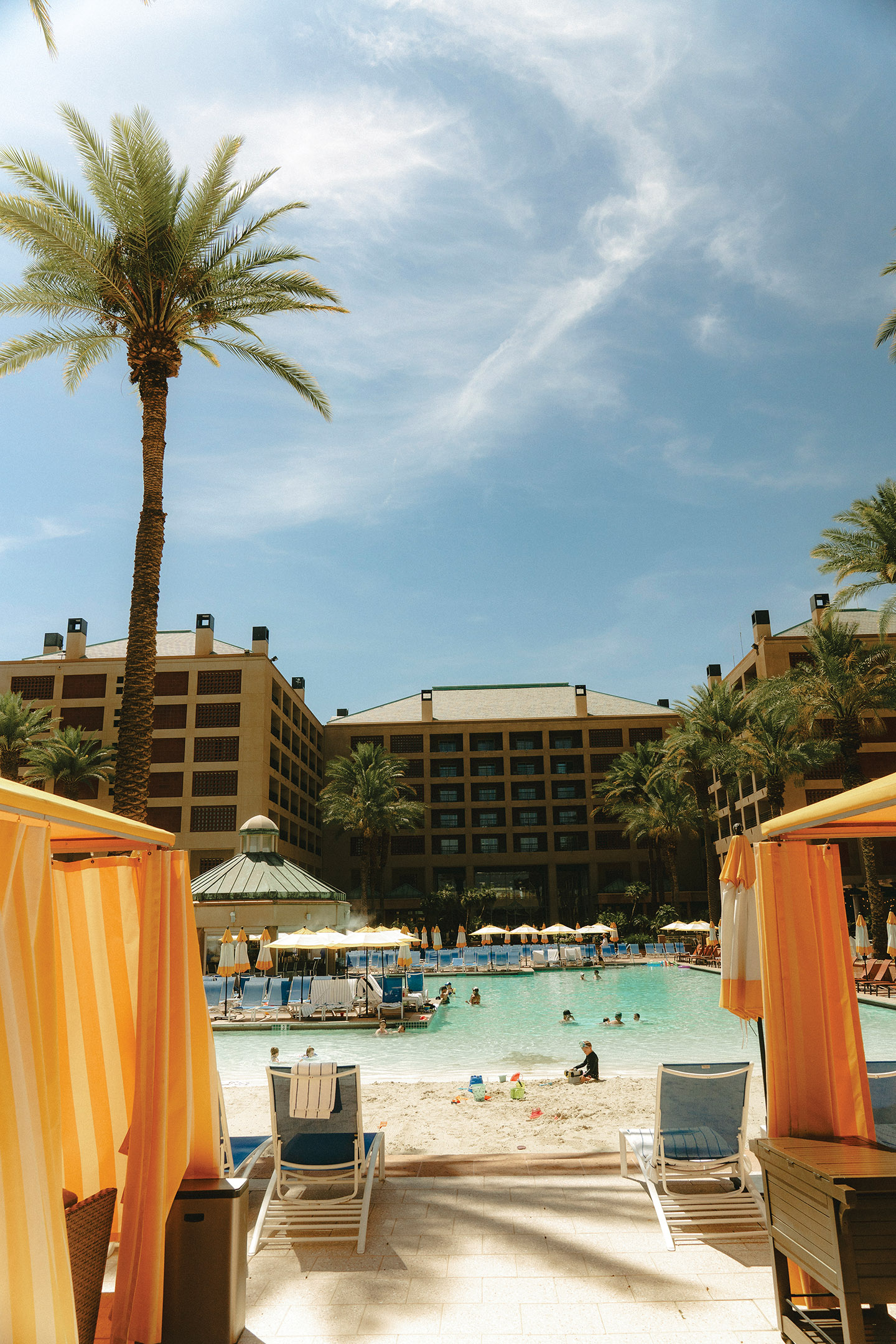 Days unfold over coffee at Café Biscotti and farm-to-table breakfasts at Cava, then spill out to the pool — said to be the valley’s largest — where a sandy beach entry and island-style bar create the illusion of a desert shore. Families find another world inside Desert Glow Entertainment, a 12,000-square-foot arcade with duckpin bowling and a gold rush–themed escape room. Additional children’s programming is available through Camp Esmeralda.