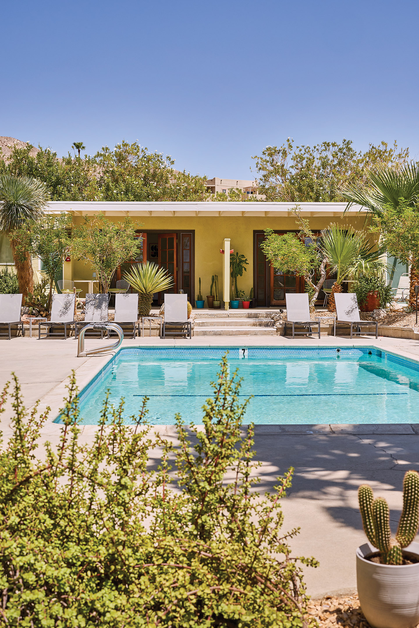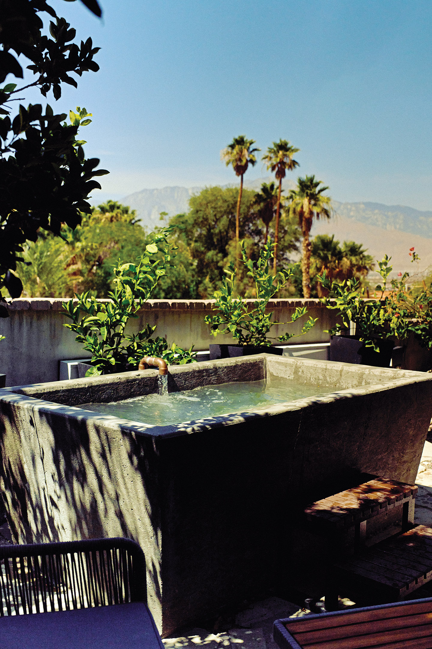 In the late 1950s, a small roadside inn called the Caravan Spa-tel sprang up over a bubbling vein of mineral-rich waters. Decades later, when Bruce Abney and John Aguilar acquired the tired property in 2001, they envisioned a boutique hideaway that would feel as rich with atmosphere as it is with healing water. The site’s own mineral well, capable of pumping 104-degree water into its pools and Jacuzzi, provided the foundation.