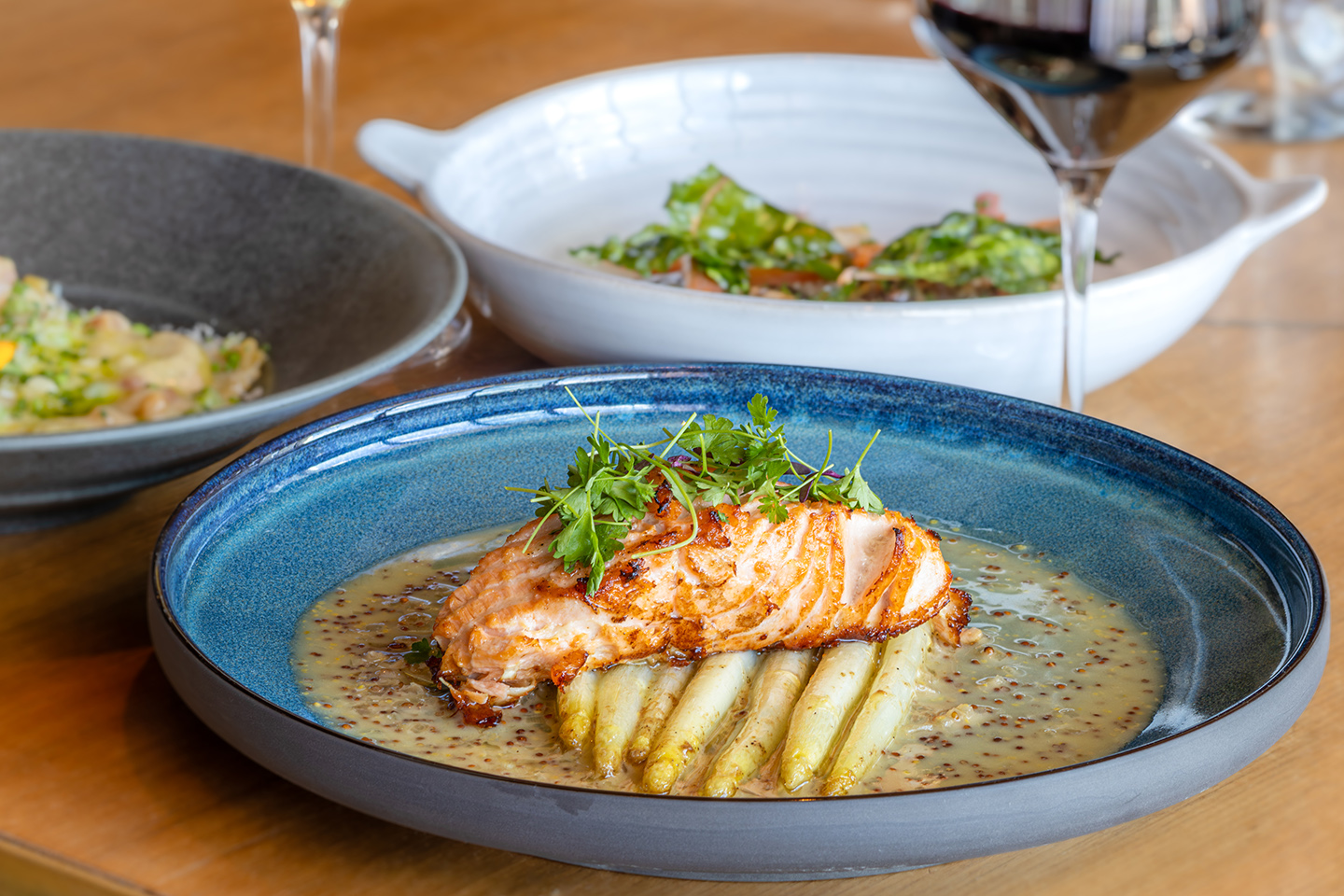 The wild-caught Icelandic salmon is served with white asparagus, a Dijon beurre blanc, and fine herbs.