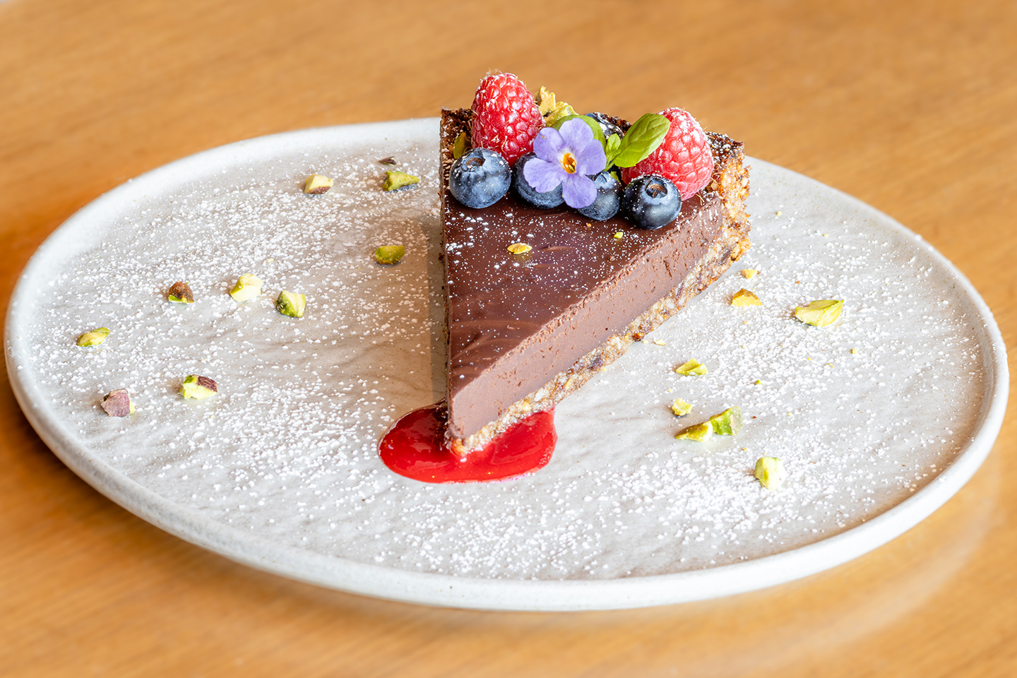 A slice of the dairy-free dark chocolate torte features a pistachio, walnut, and date crust and is topped off with fresh berries and a raspberry coulis.
