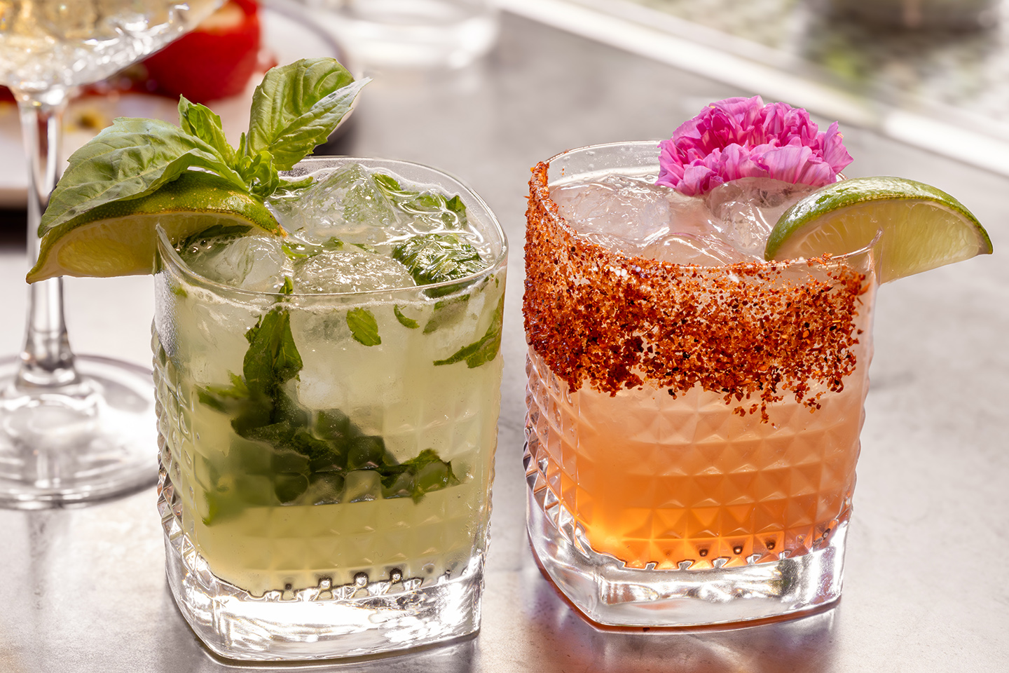 The classic mojito (left) stars Havana Club rum, fresh lime juice, sugar, minced mint, and a splash of club soda. Try the Rowan Rita, (right) made with Tanteo jalapeno tequila, Mommenpop blood orange, fresh squeezed lime juice, agave, and watermelon juice.