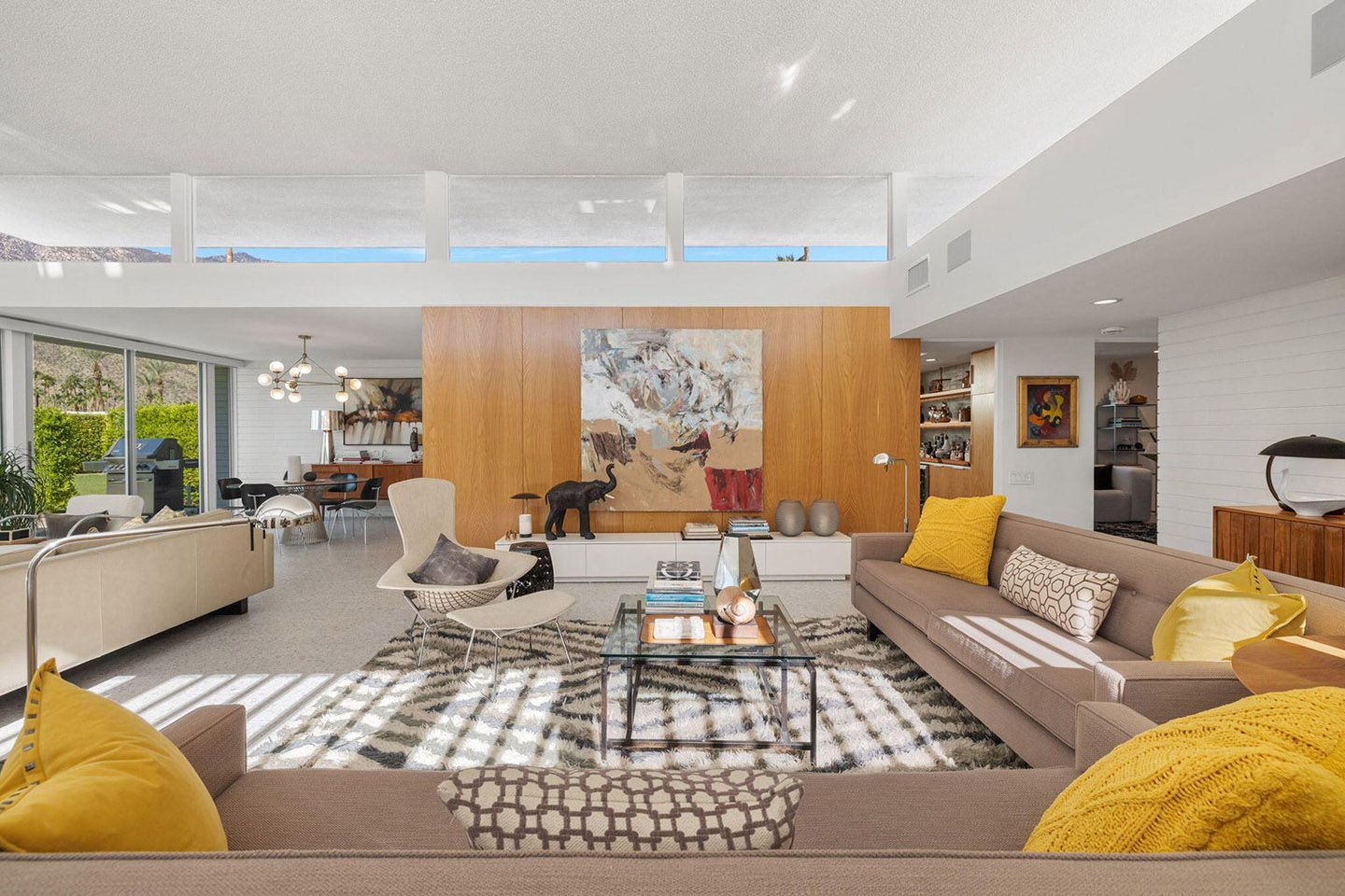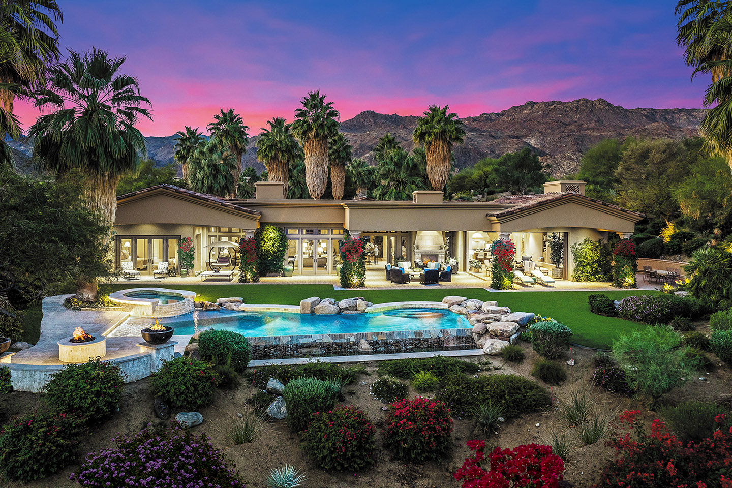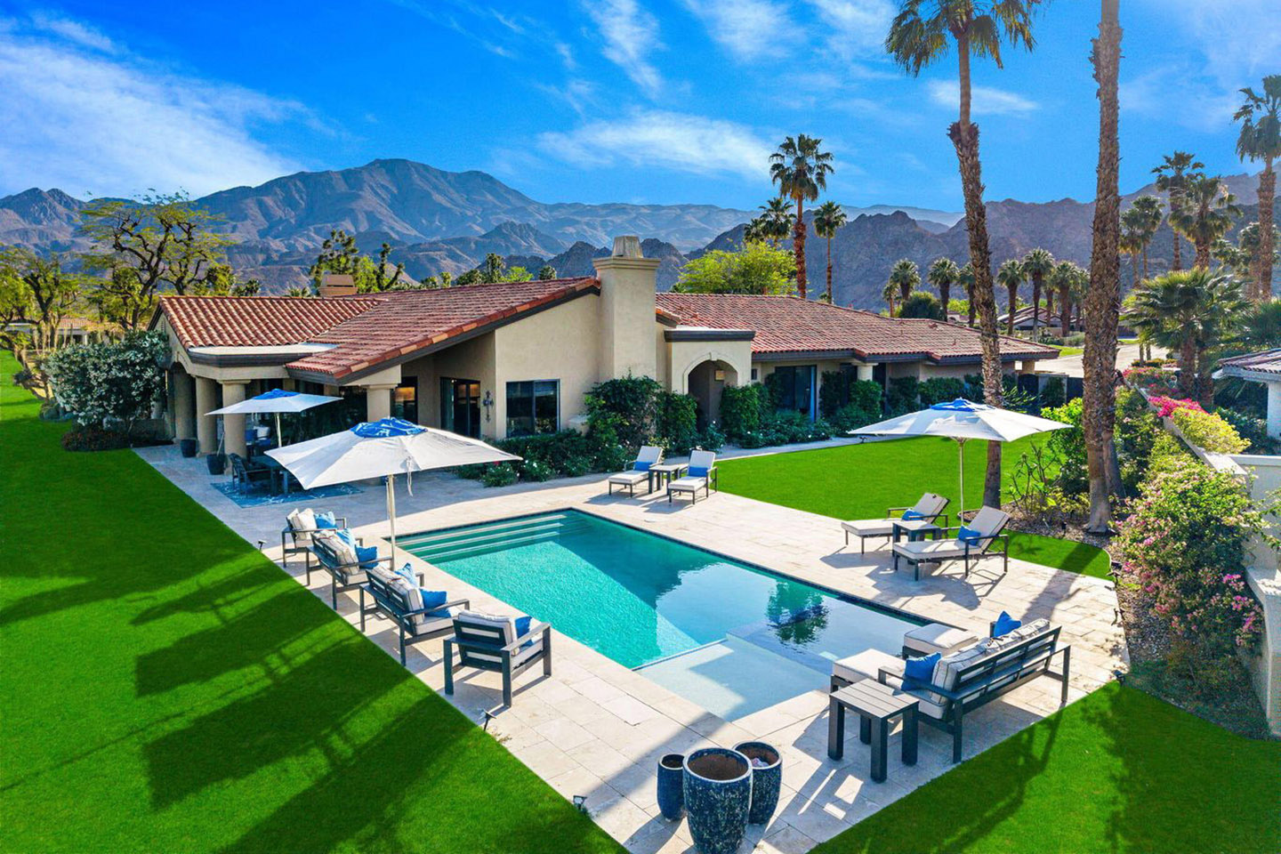 Discover an exceptional enclave nestled within the heart of Rancho Mirage. This 4,806-square-foot home with an elegant combination of dark timber beams, natural stone, and smooth stucco, welcomes you into a world of sophistication. At 4 Via Perugia, beyond the inner courtyard, enter through reeded glass doors into a grand open-concept design featuring 15-foot cathedral ceilings, a modern fireplace, and abundant natural light.