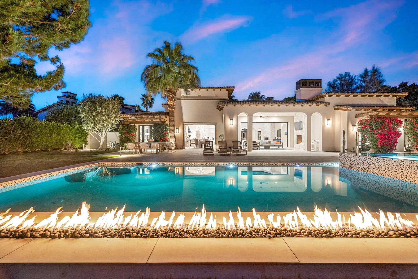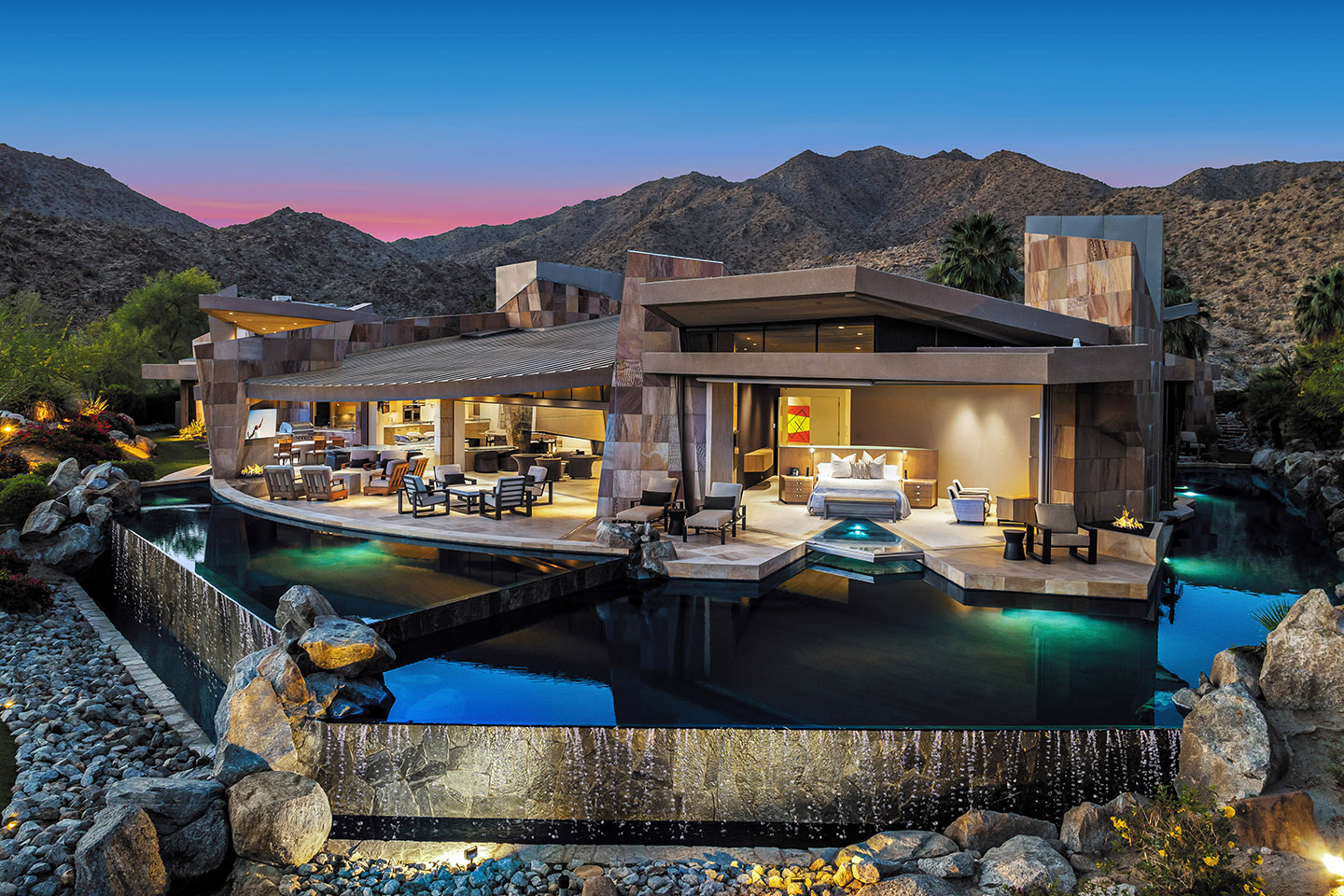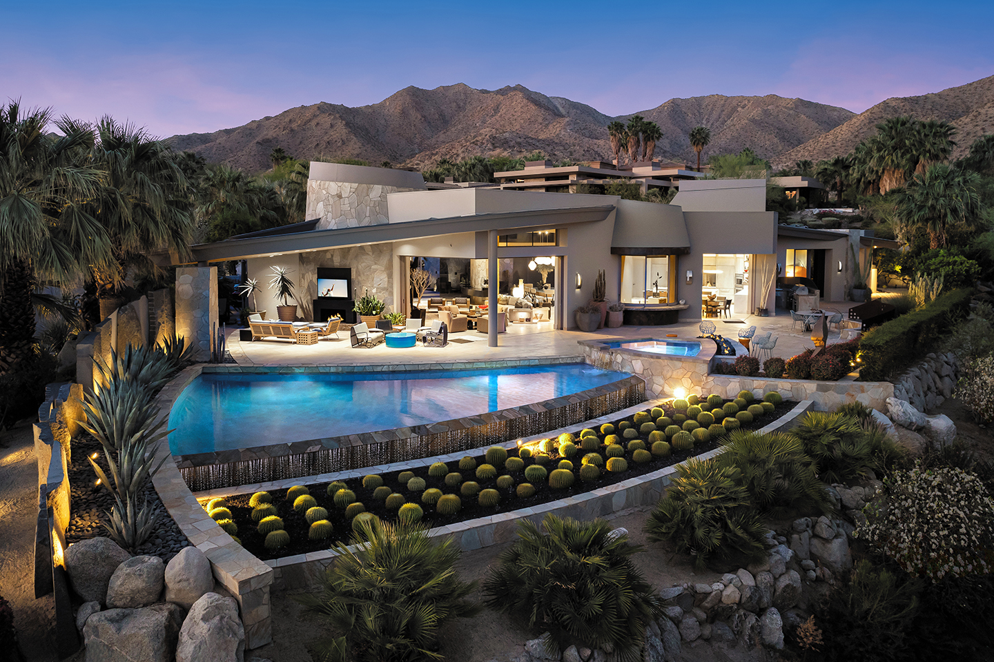 Discover an exceptional enclave nestled within the heart of Rancho Mirage. This 4,806-square-foot home with an elegant combination of dark timber beams, natural stone, and smooth stucco, welcomes you into a world of sophistication. At 4 Via Perugia, beyond the inner courtyard, enter through reeded glass doors into a grand open-concept design featuring 15-foot cathedral ceilings, a modern fireplace, and abundant natural light.