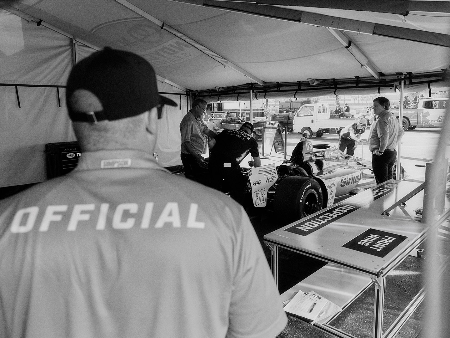 Marcus Armstrong’s Meyer Shank Racing entry rolls through the technical inspection tent.