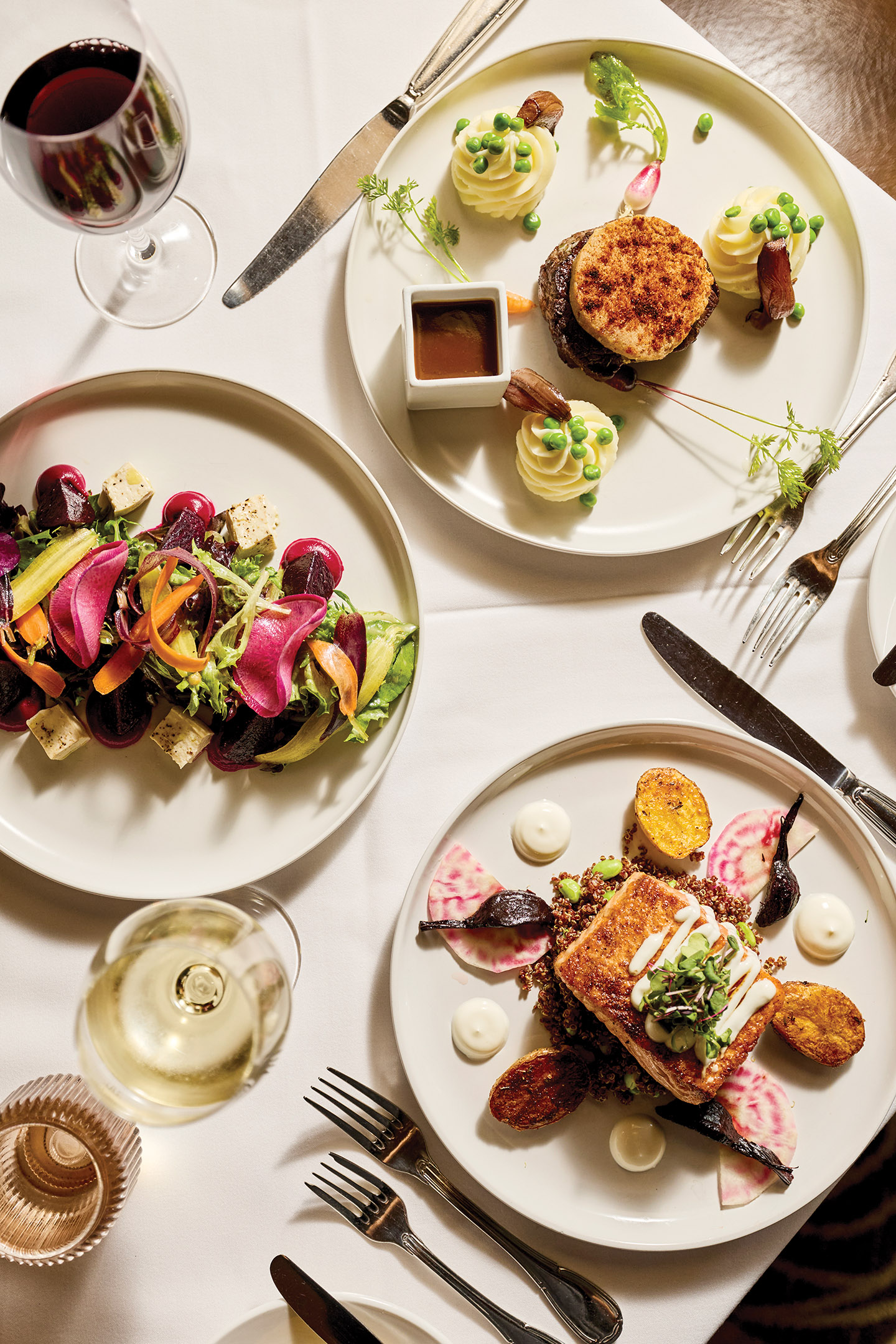 Fresh salads and hearty yet light entrées, like the Icelandic pan-seared salmon, pair well with wine.