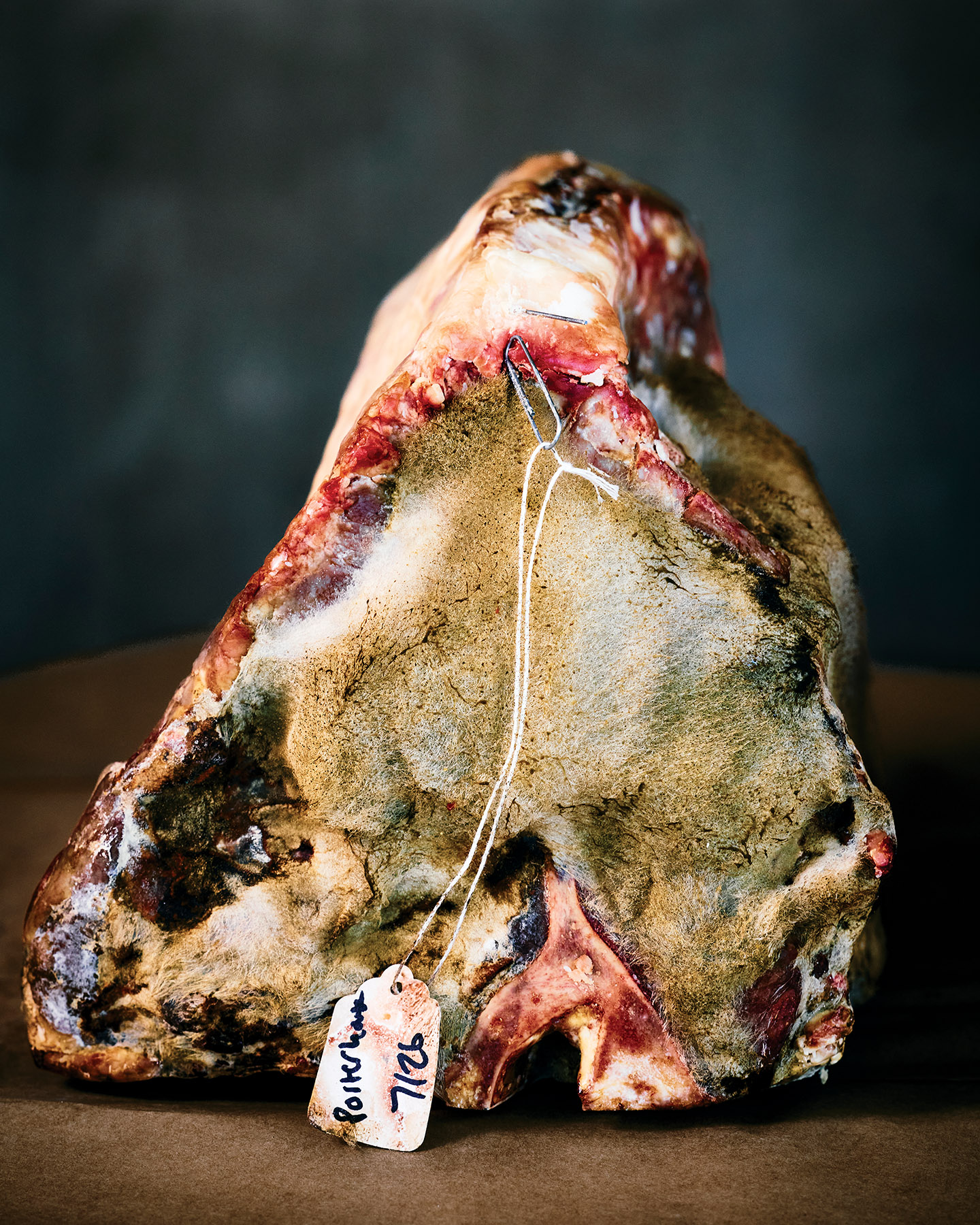 Inside, two key transformations unfold. First, the moisture is removed from the meat, which “concentrates the flavor to give it more of an unctuous, meaty, richer taste,” chef de cuisine Nyitre Rodgers says. The longer the aging — 45, 60, even 90 days — the more intense the nutty, umami-rich flavor.