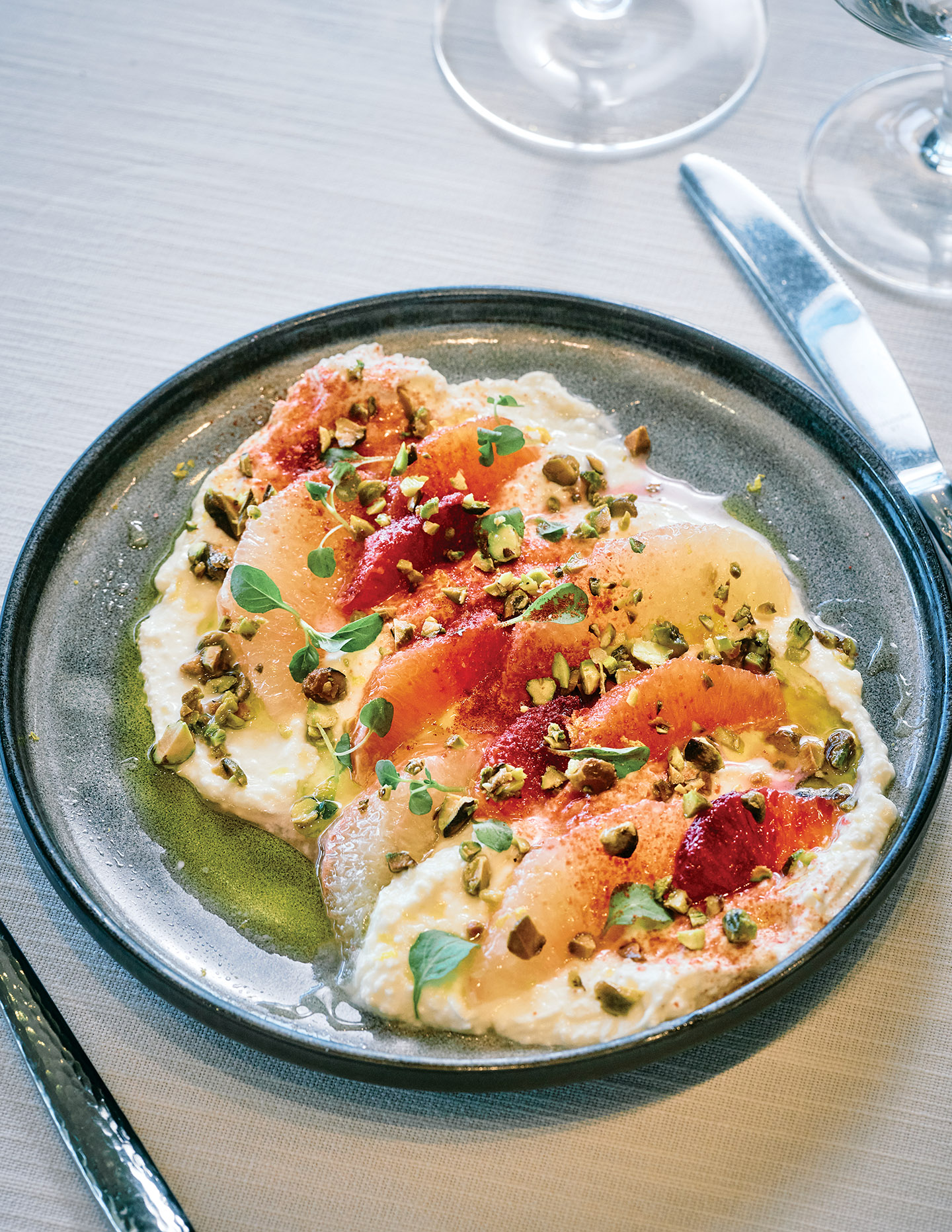 Whipped feta with citrus, pistachios, and micro basil and mint.