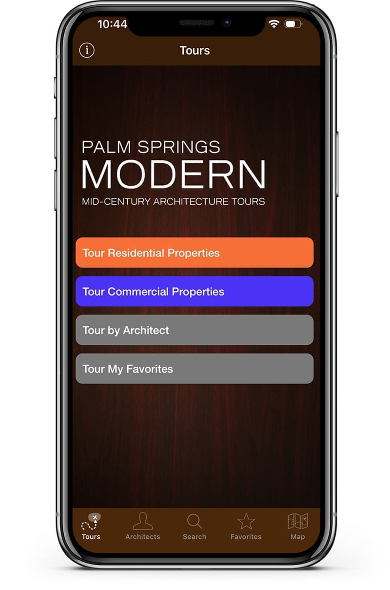 Palm Springs Modernism: Mid-Century Architecture Tours app from the App Store for Apple iOS and Android. Over 80 guided tours, profiles of 12 leading architects, video of premier properties, and new & historic images.