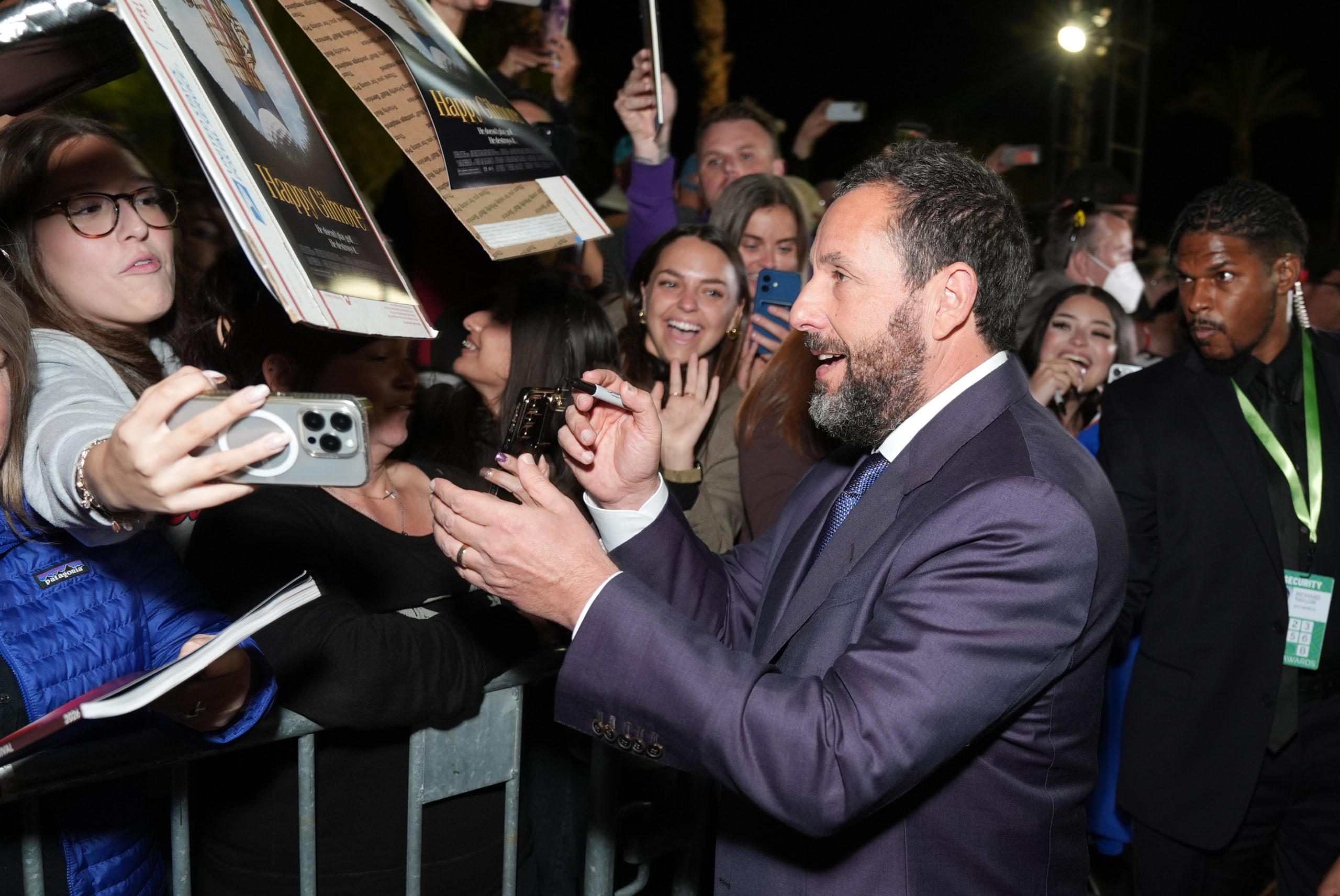 Adam Sandler leans in to sign an autograph in the fan zone outside Palm Springs Convention Center.